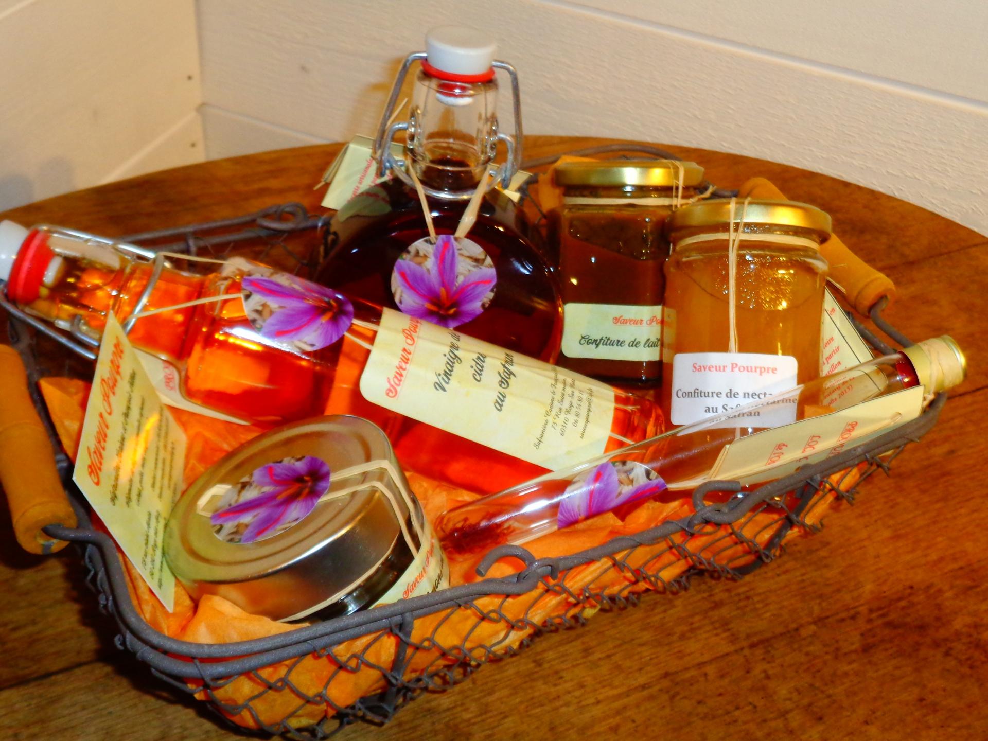 Gelée de monbazillac, confiture de lait, sirop de sucre de cannne, confiture de fruits, vinaigre de cide et 0.2 g de stigmates de Safran